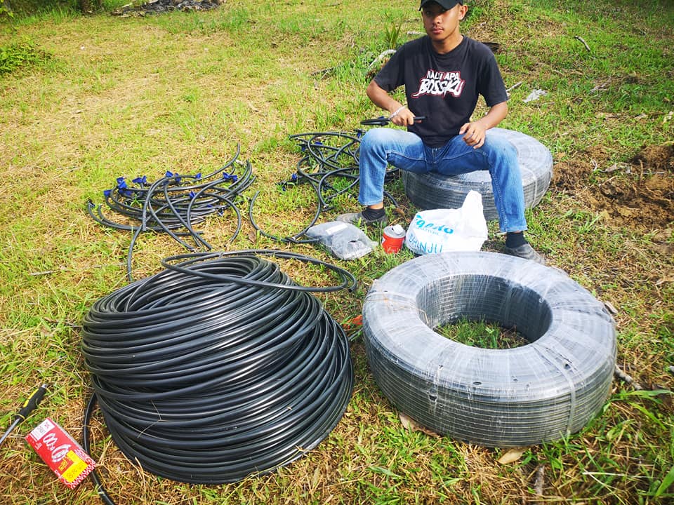 Kami juga memasang satu set Sistem Titisan Air Automatik atau AWDS untuk menyirami 50 pokok anak benih durian yang baharu ditanam di dusun ini.